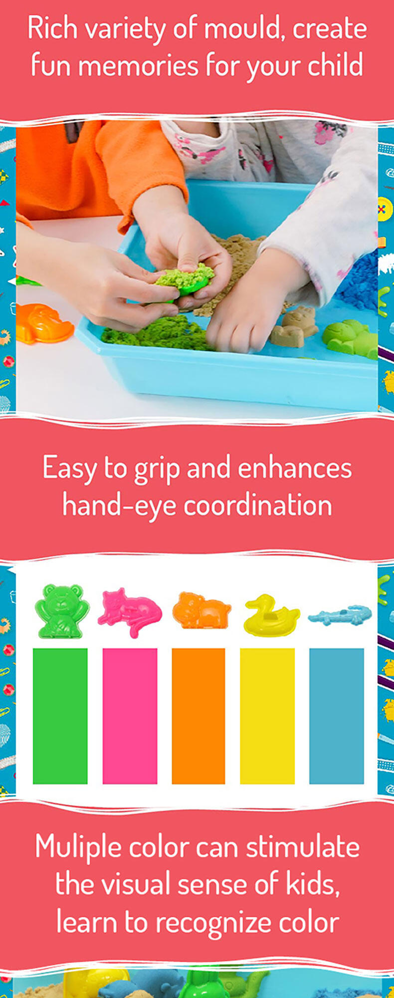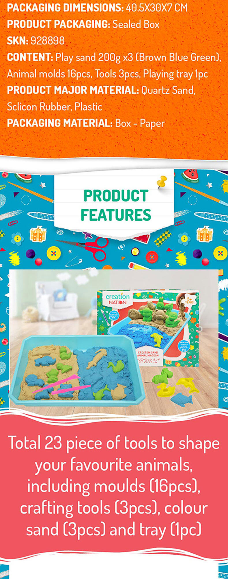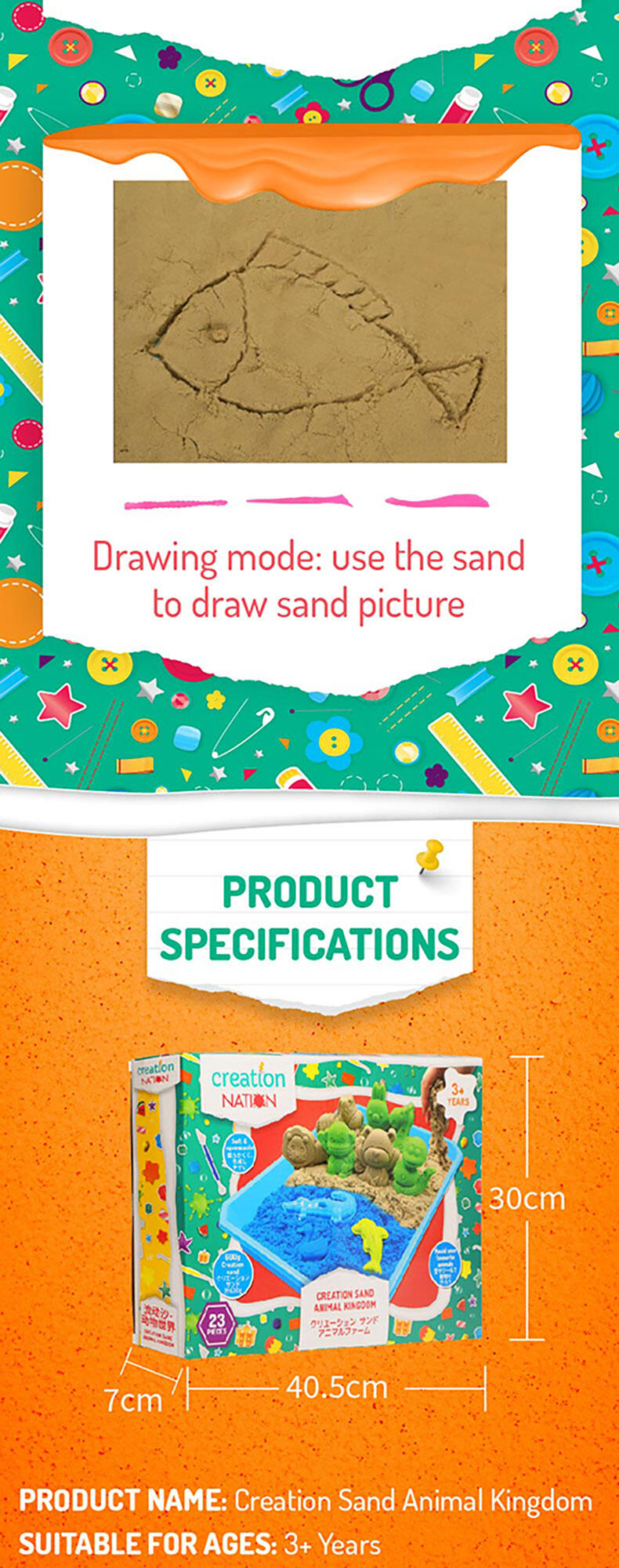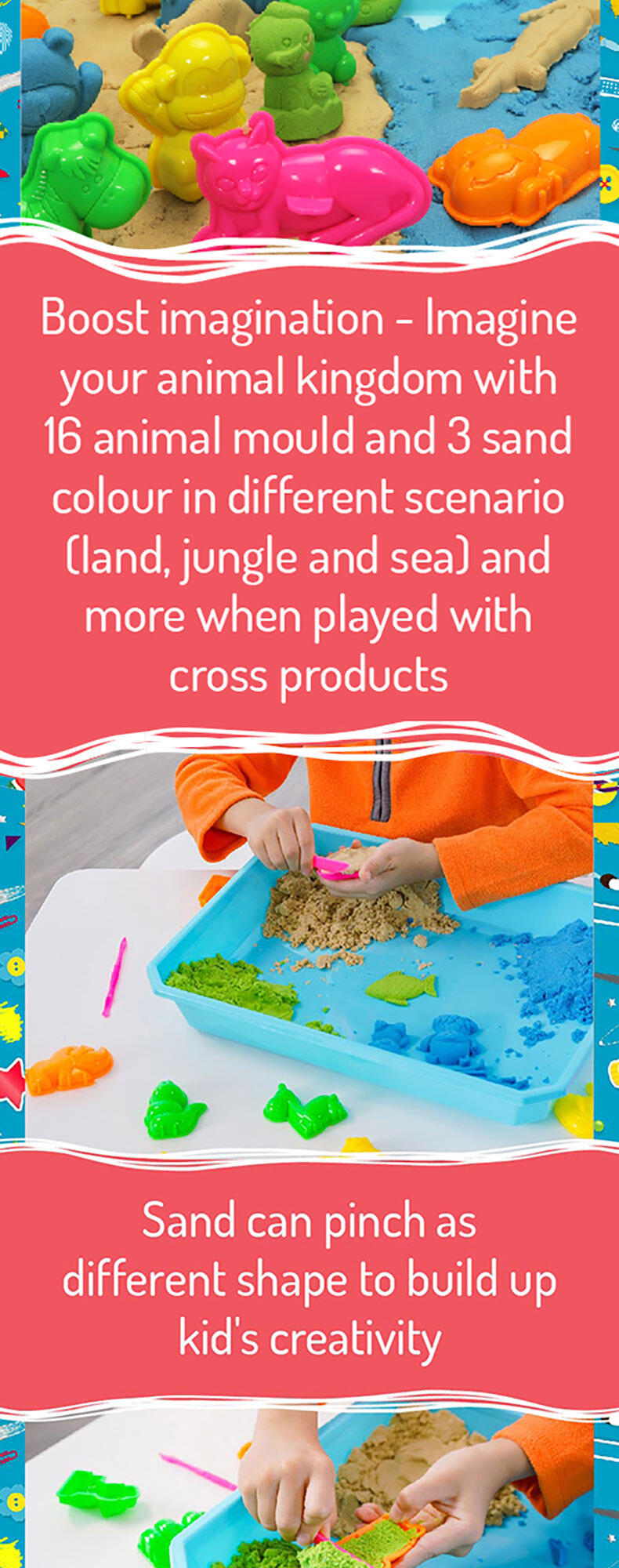 The craziest animal farm is awaiting their masters! Unleash the young artists' imagination with the fantastic Creation Sand. By moulding their green dolphin, brown giraffe or blue monkey and showing them off to others on the cute carrying tray, their hand-eye coordination, communication, and social skills are developed.