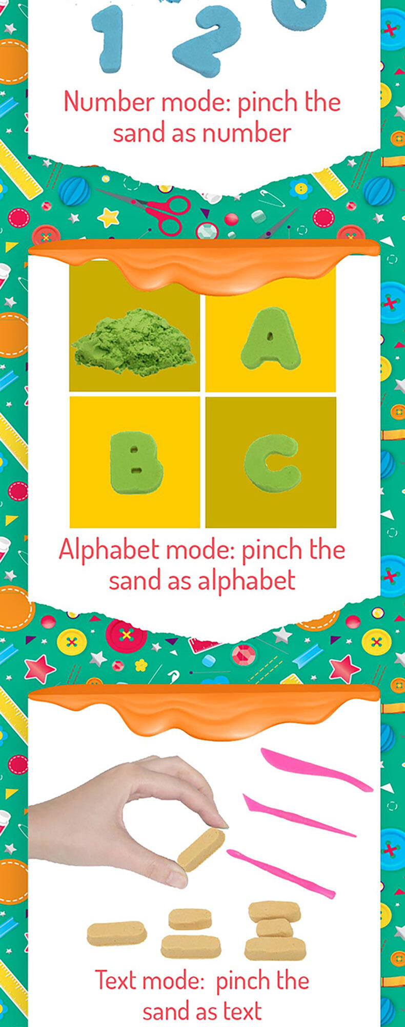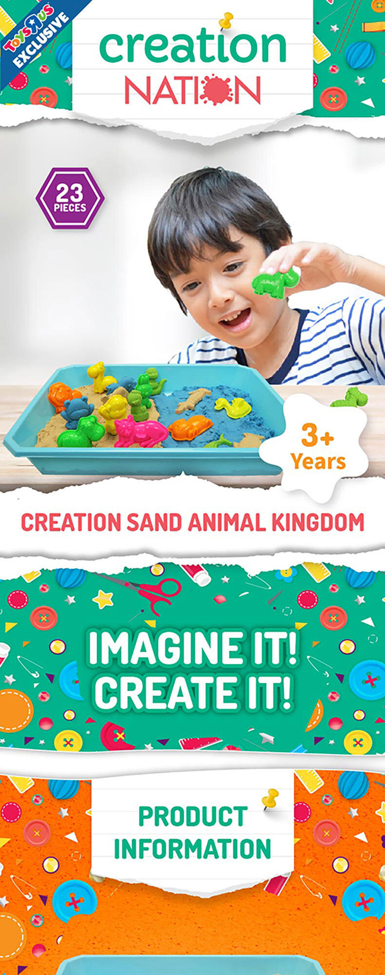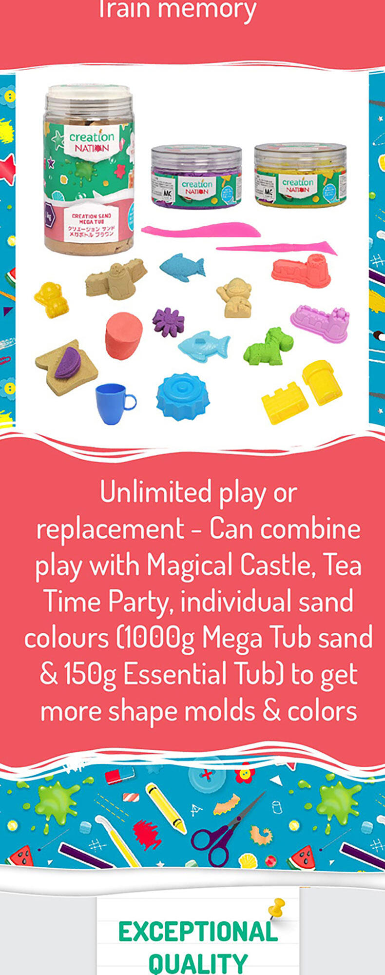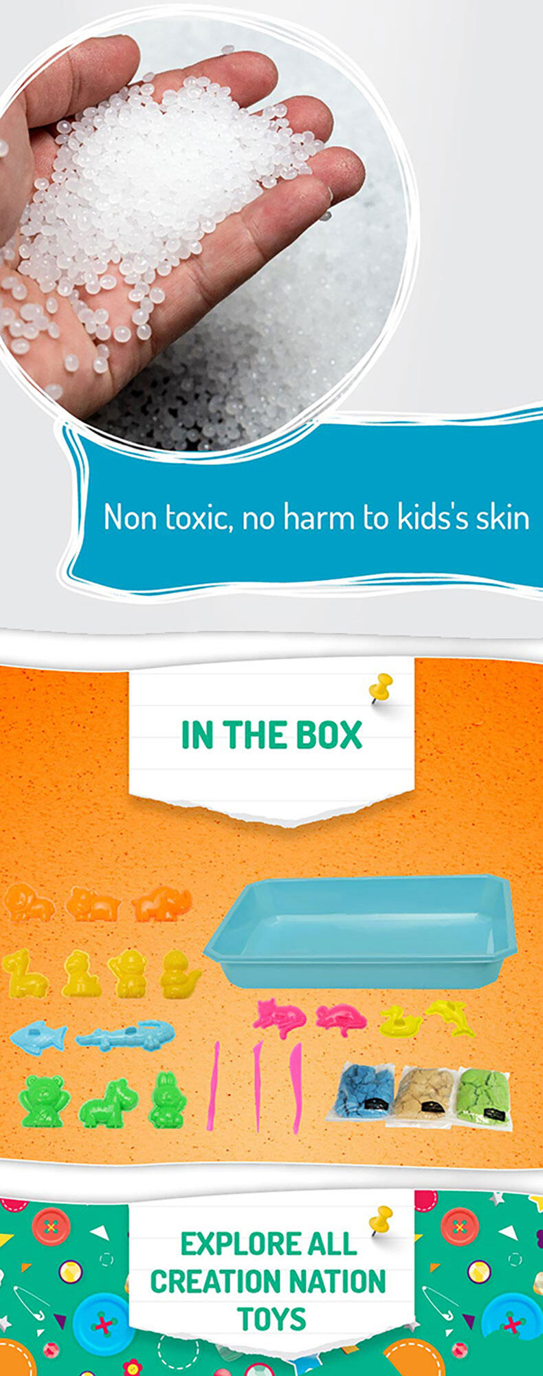 The craziest animal farm is awaiting their masters! Unleash the young artists' imagination with the fantastic Creation Sand. By moulding their green dolphin, brown giraffe or blue monkey and showing them off to others on the cute carrying tray, their hand-eye coordination, communication, and social skills are developed.