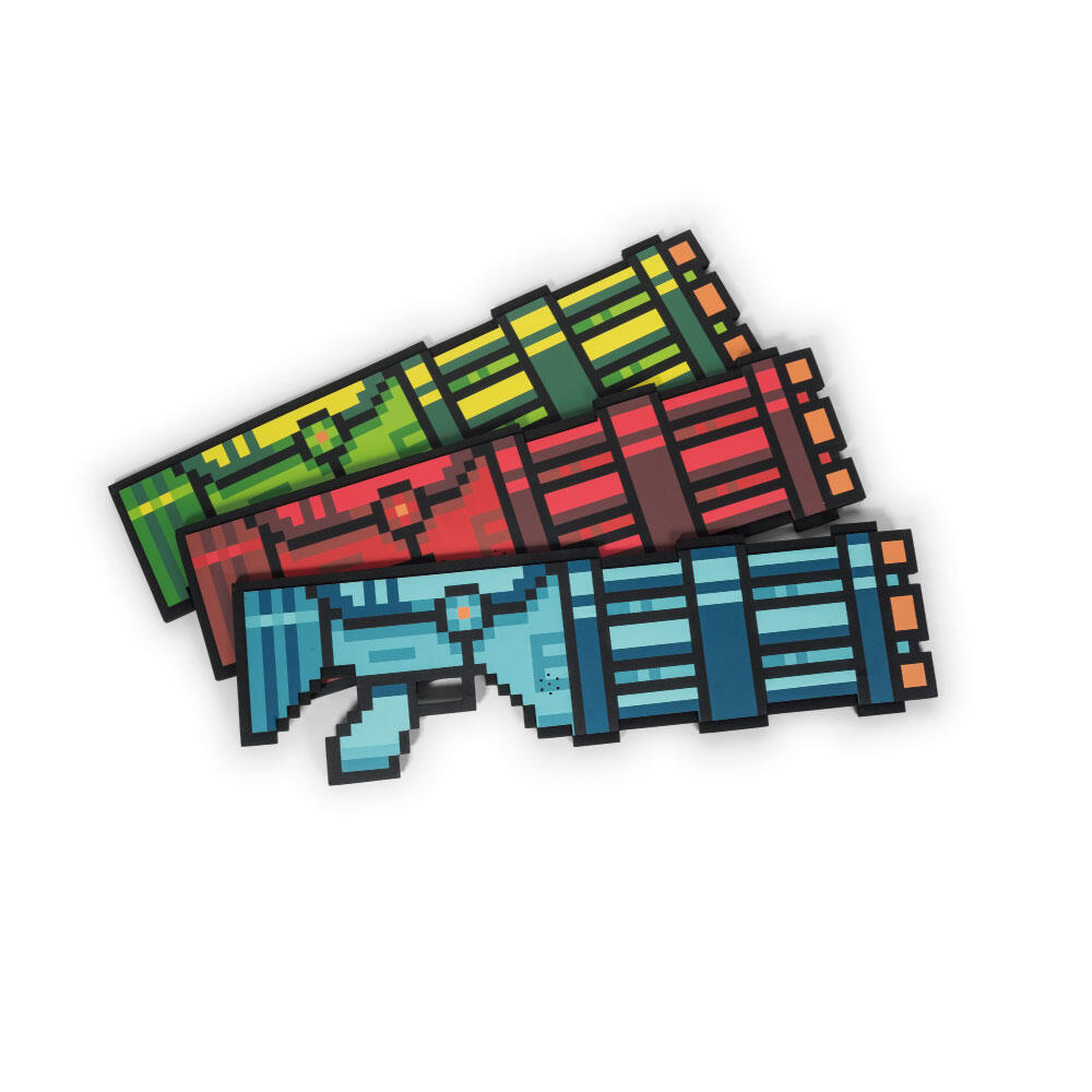 With this Mega Blaster, you little one will dive into the pixelated world protect their build up creations. With differnt sound and light effects, taking down foes who attack their town has never been easier. How will this pixelated story end?
