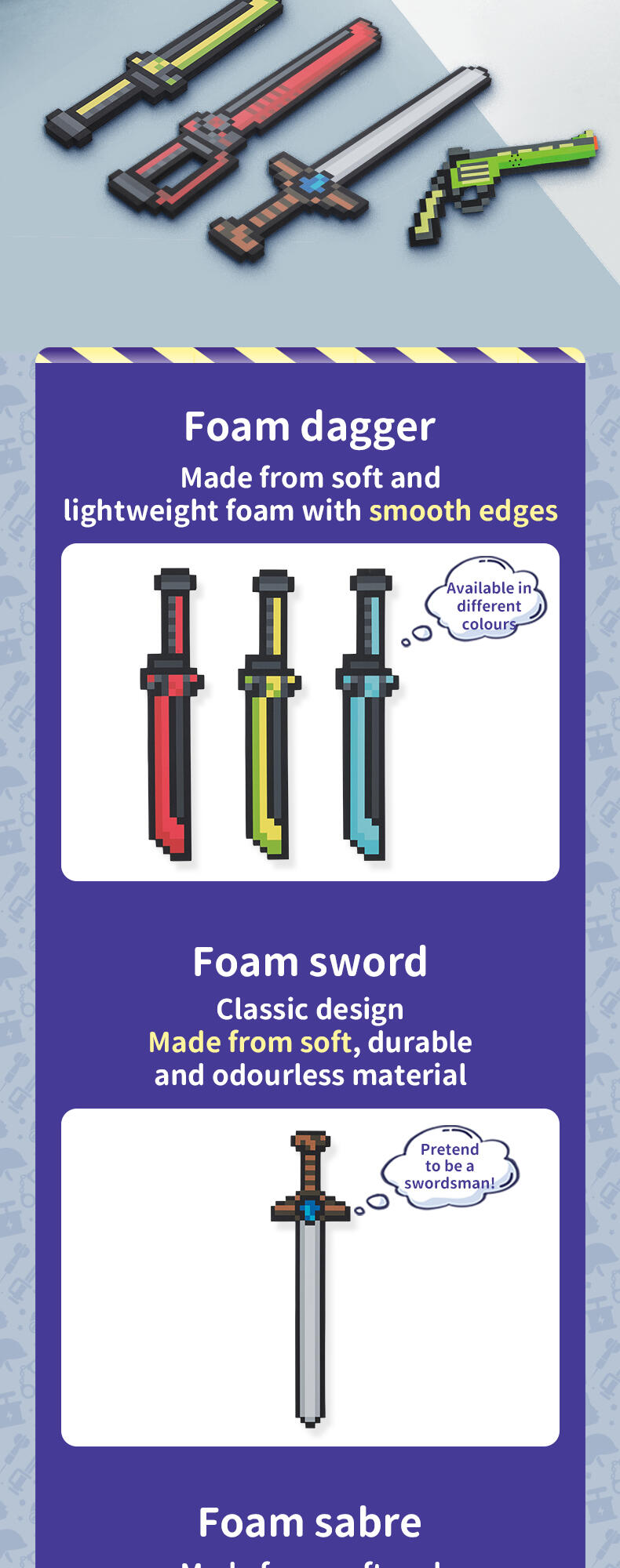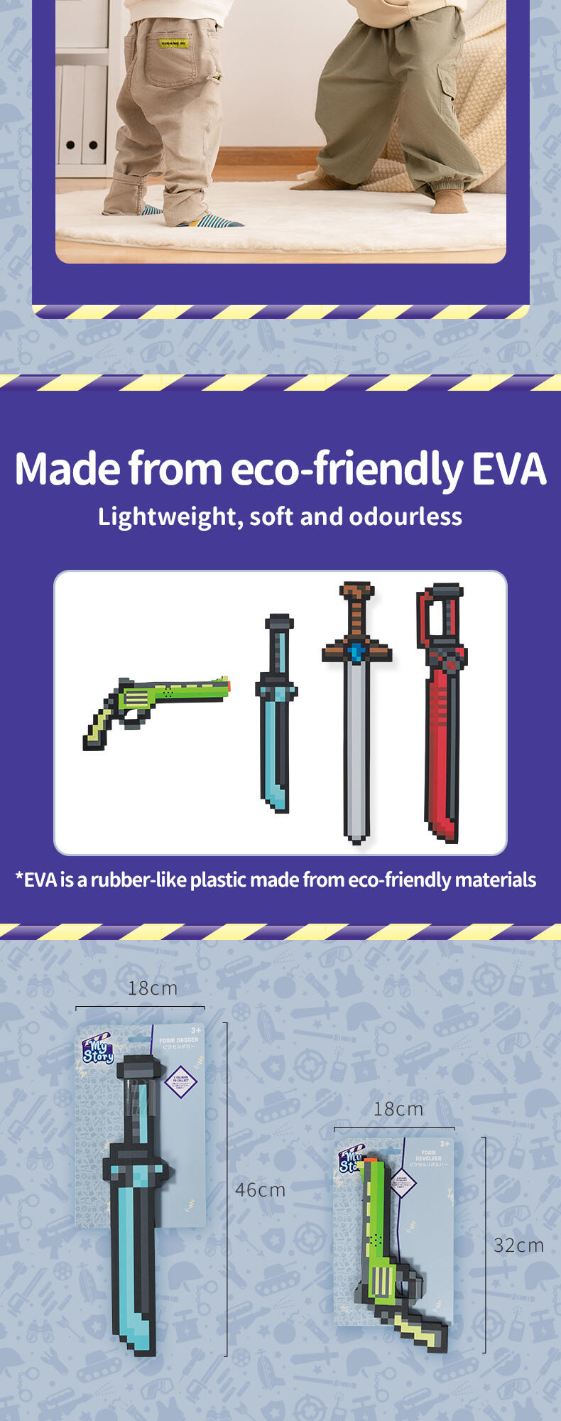 Dive into the pixelated world where your little one can protect their built up creations. Made out of high quality safe EVA foam, this toy is safe for playing. The perfect gift for building block gamers and their pixel adventures! How will this pixelated story end?