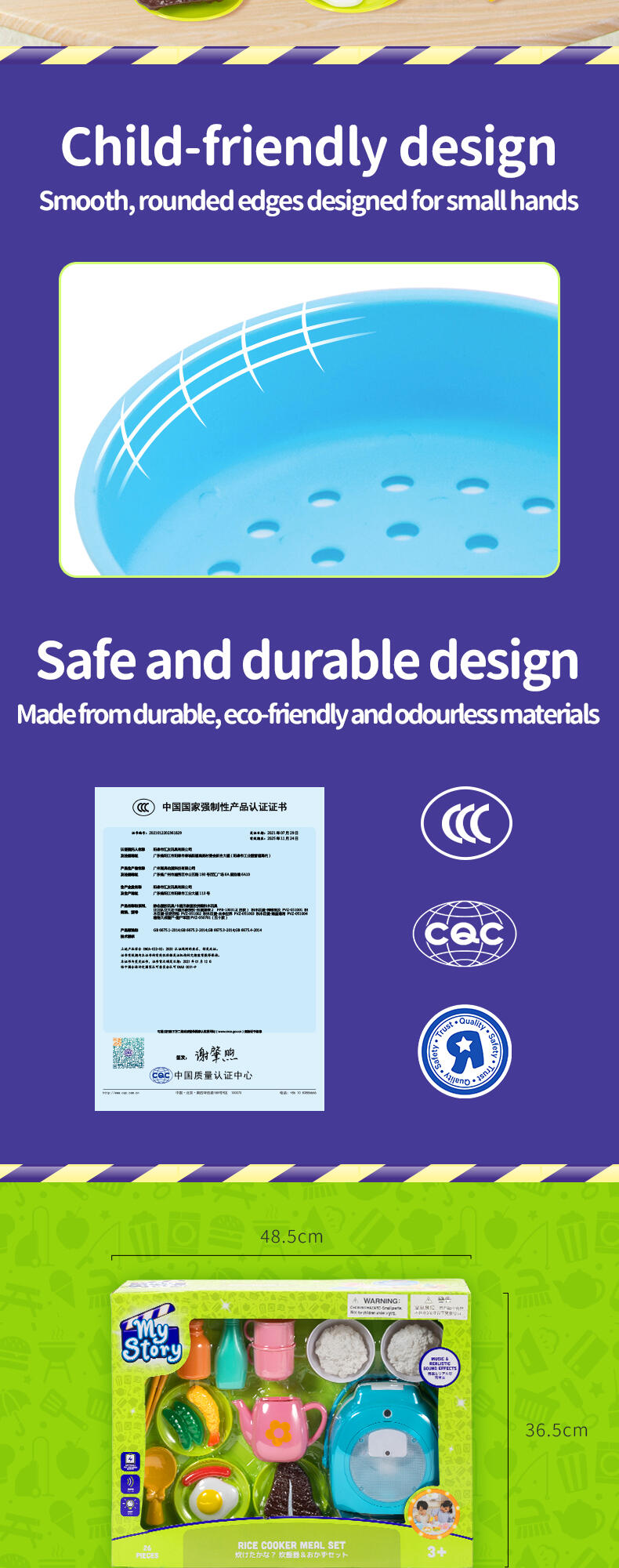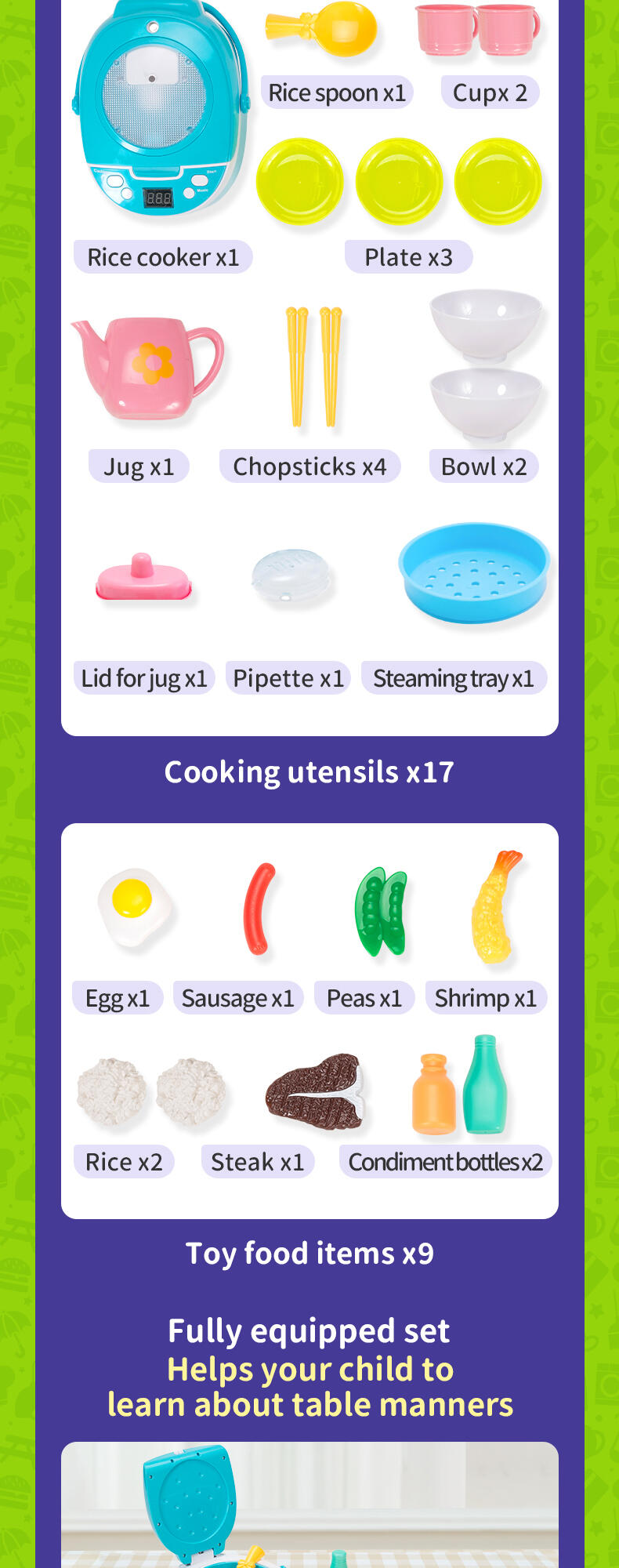 The realistic functions of this mini rice cooker will delight little chefs who have the chance to build their own stories and play scenarios, supported by the authentic look and feel of this set. The rice cooker has steam and sound effects, just like the real thing, and the set also includes utensils and ingredients to create delicious meals. Kids can develop their creative abilities, build a positive relationship with a variety of nutritional foods, and immerse themselves in practical and life-like scenarios.