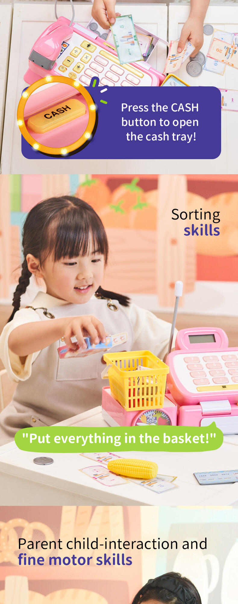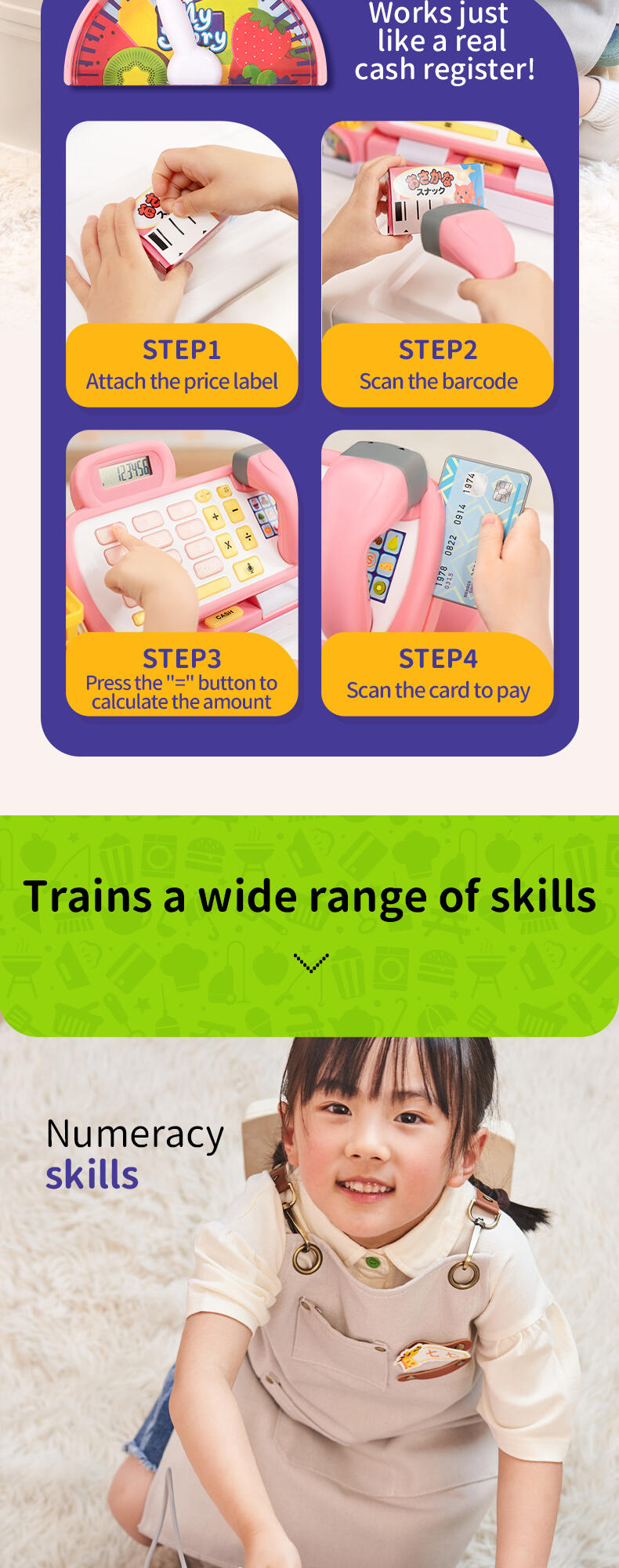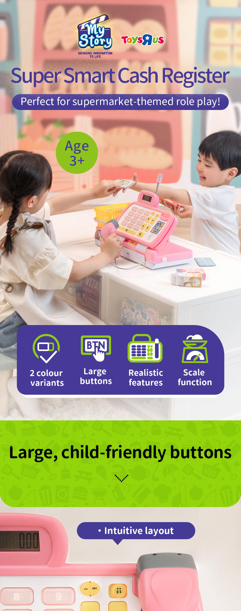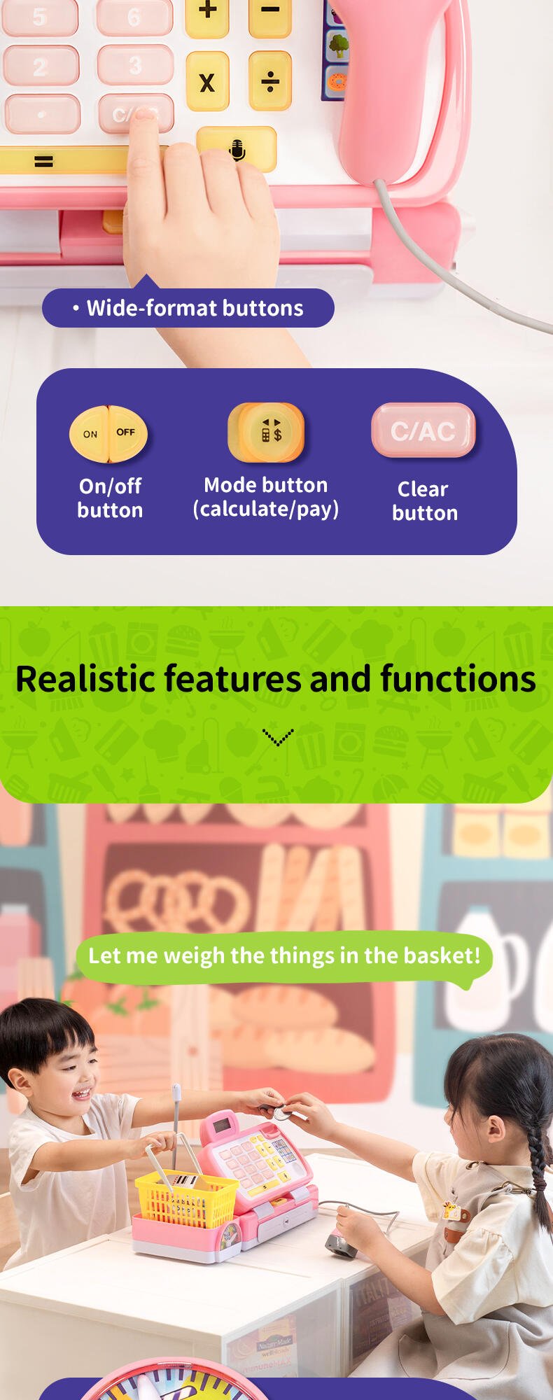 The unique functions of this cash register make for a totally immersive play experience. It has a working calculator for totalling how much customers spend, a scale to weigh produce, microphone for when you need to call for assistance, and fun, realistic sound effects. The set also includes a credit card, coins, paper money, pretend food and boxed goods. Kids will love the chance to run their own little store, serving customers and creating realistic play scenarios that develop independence, social skills and creative abilities. Its a supermarket story waiting to be written
