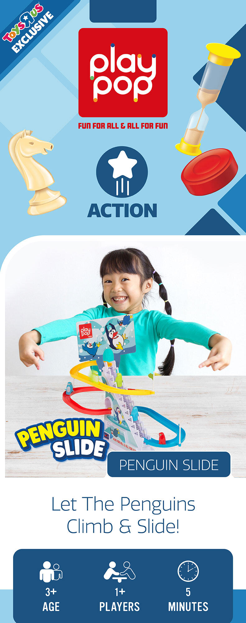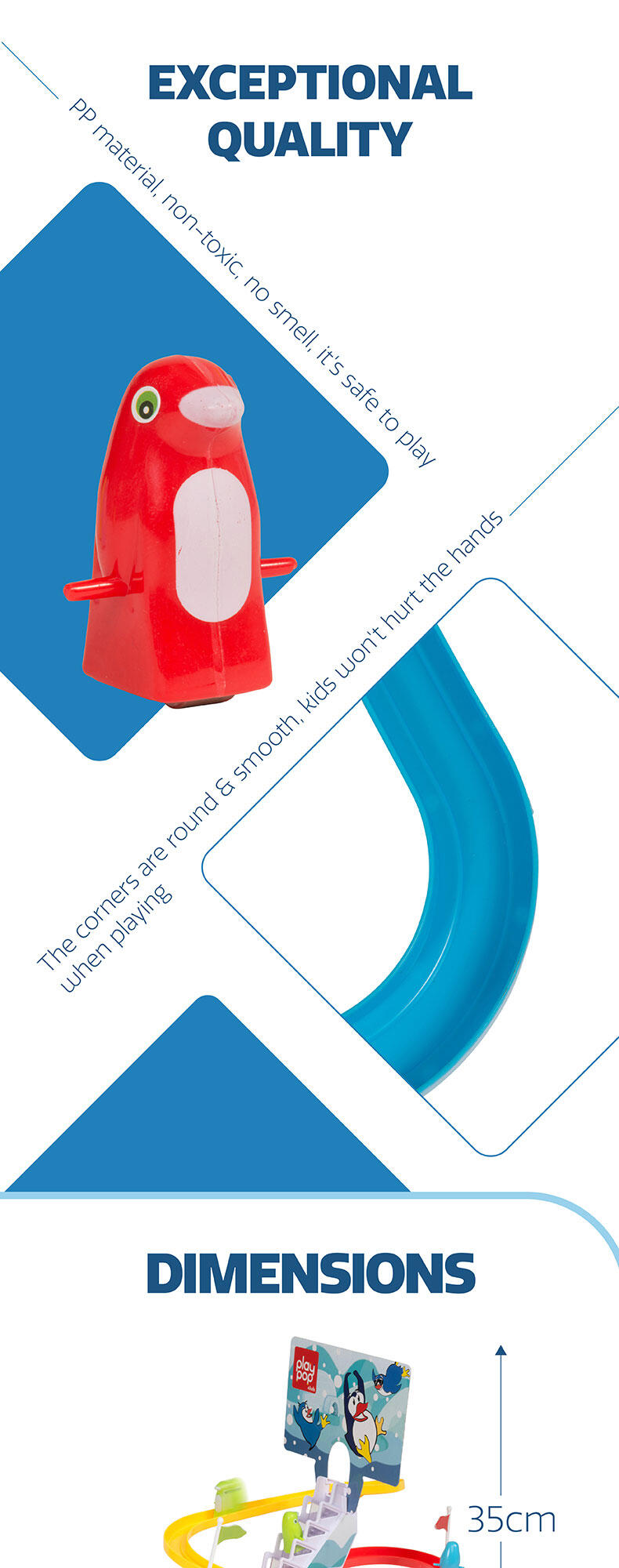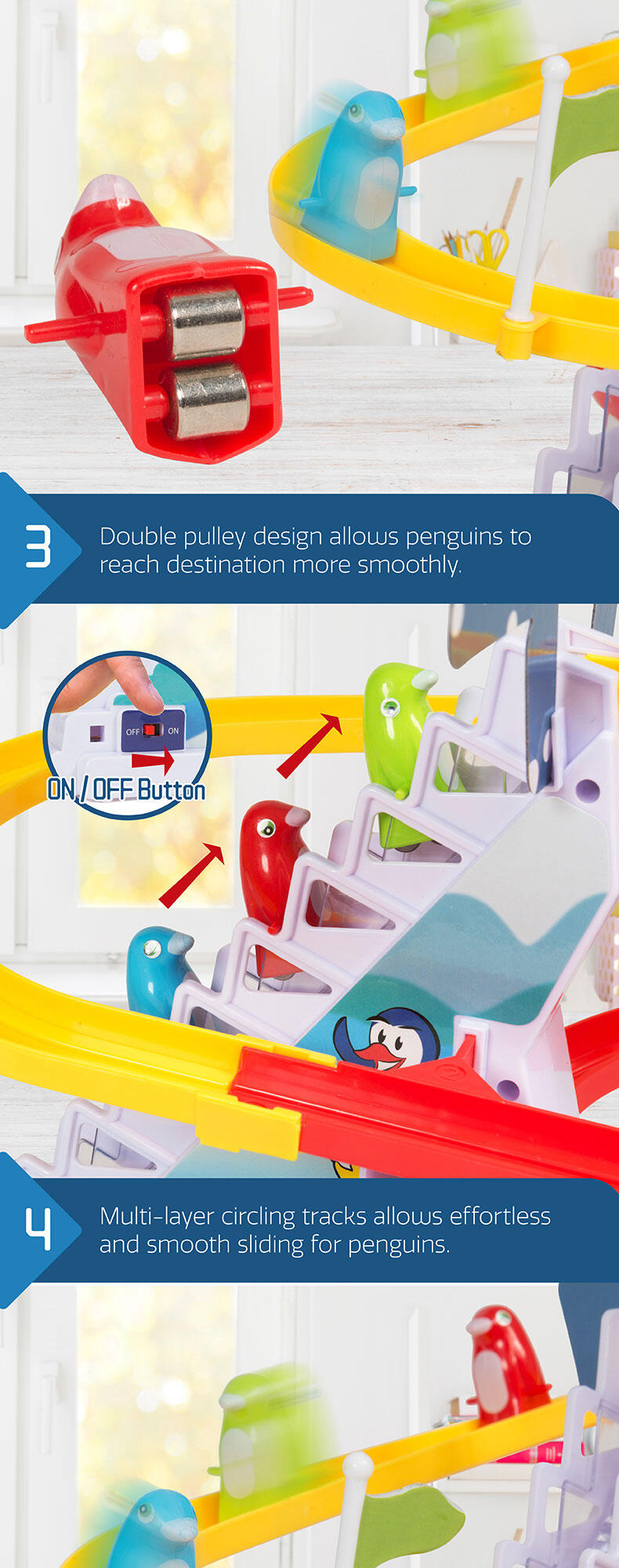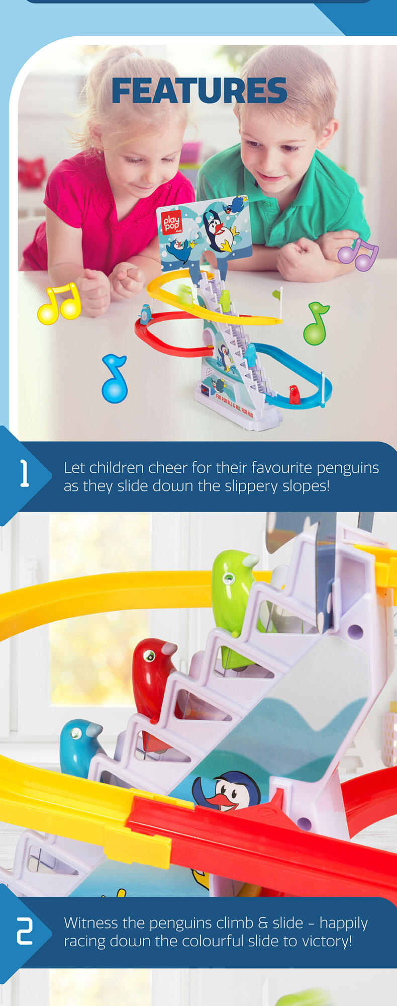 Watch the penguins climb up the steps and then happily race down the colourful slide to reach the bottom of the steps. It’s super entertaining. The adorable penguins try to keep up with each other but always find themselves seconds behind. Together with the joyful music, children cheer for the penguins wholeheartedly.