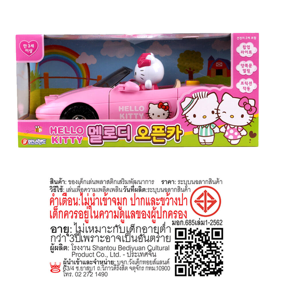Light and sound come with Hello Kitty figure and Daniel figure.There are 5 Hello Kitty speaking sounds, 3 nursery rhymes, and 5 nursery rhyme melodies. Car doors can be opened on both sides. Press the button on the front of the car to turn on the headlights. The car's dashboard has flashing lights. Pull back car. Battery: AA 1.55V x 2 (not included)