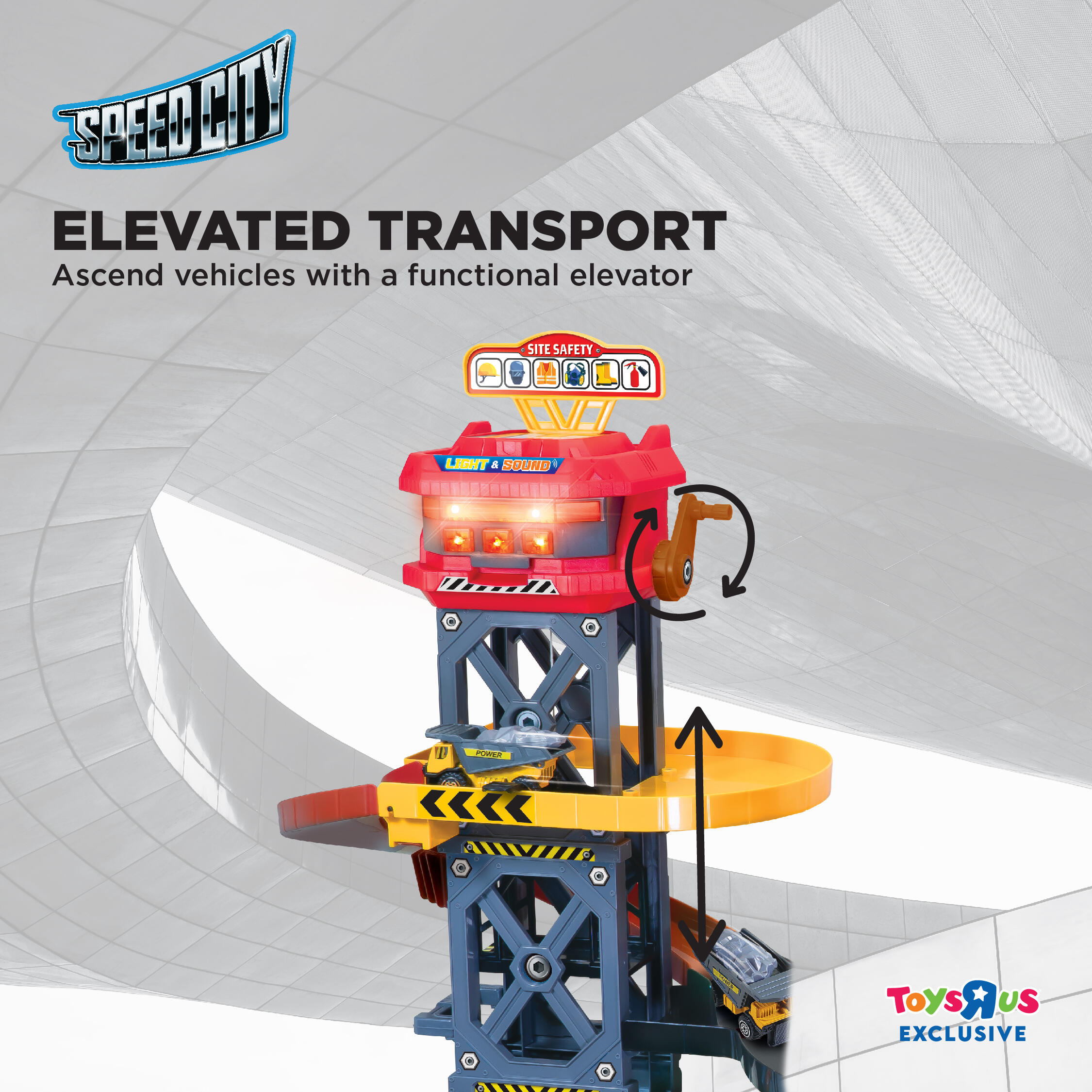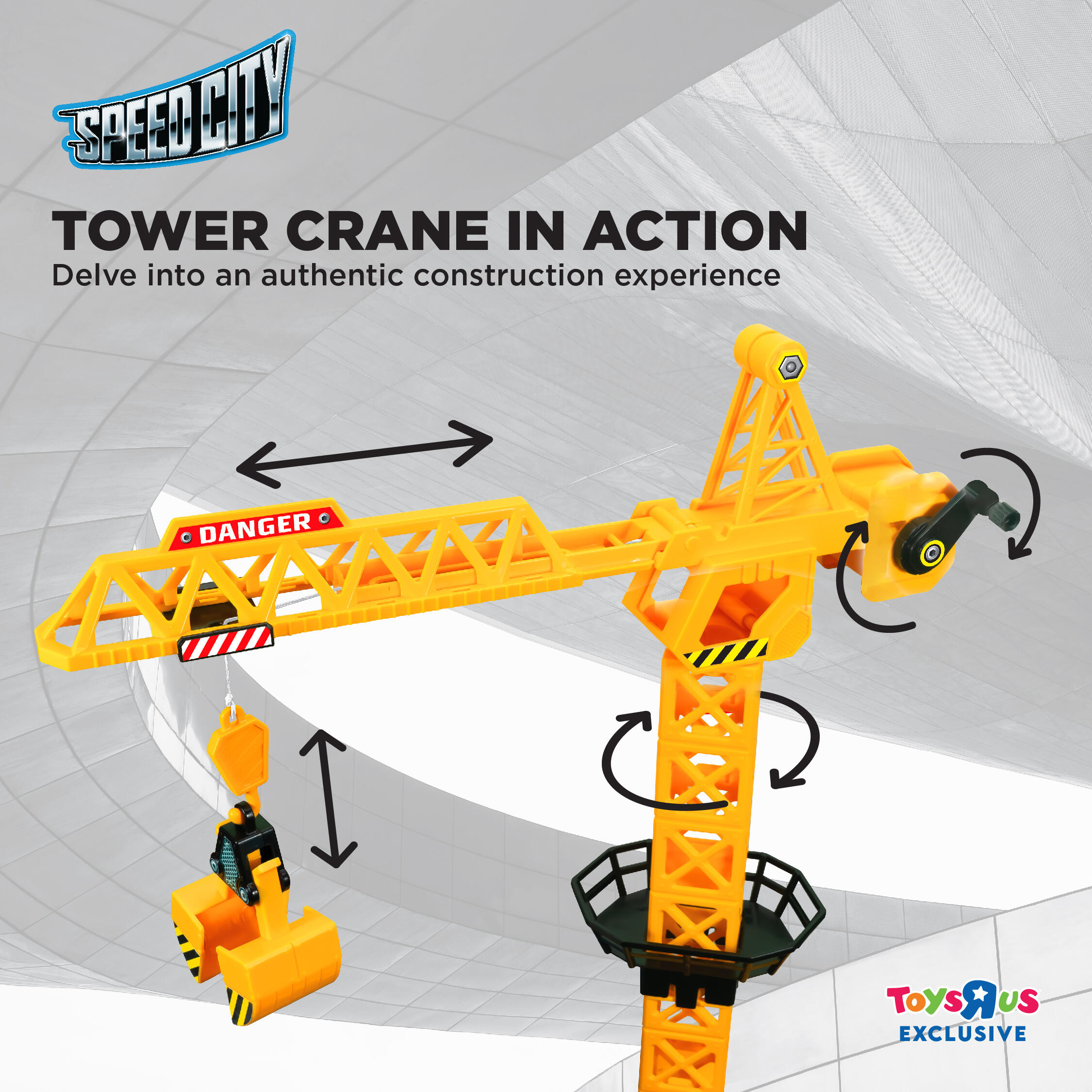 Lights & Sounds Tower Crane Construction Site includes 5 die-cast construction vehicles. Realistic construction site has various scenes to play with.