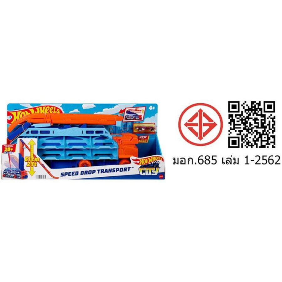Hot Wheels City Speed Drop Transport Hauler ผสมผสานความสะดวกสบายของรถฮ็อตวีลที่ดูเท่เข้ากับความยอดเยี่ยมของสนามแข่งแนวตั้งสองฟุตที่เชื่อมต่อกับฉากอื่นๆ ในโหมดการขนส่ง รถกึ่งพ่วงขนาดใหญ่สามารถบรรทุกรถของเล่นขนาด 1:64 ได้มากกว่า 20 คัน ขณะหมุนบนล้อขนาดใหญ่ทั้งหกล้อ ปลดล็อคด้านหลังและแปลงโฉมรถบรรทุกคันนี้ให้กลายเป็นรางสูง 2 ฟุตอันน่าทึ่งเพื่อความตื่นเต้นสุดขีด ผาดโผนรถลงจากแรงโน้มถ่วงอันยิ่งใหญ่ที่สามารถเชื่อมต่อกับชุดอื่น ๆ (แทร็กเพิ่มเติมจำหน่ายแยกต่างหาก) รวมยานพาหนะ Hot Wheels หนึ่งคันเพื่อลากจากการเดินทาง สีและการตกแต่งอาจแตกต่างกันไปสำหรับ 22 รวมถึง รวมรถขนส่ง Hot Wheels City Speed Drop 1 คันและรถ Hot Wheels 1 คัน