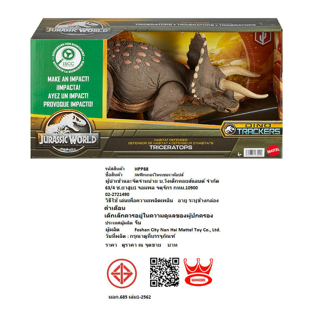 จูราสสิคเวิลด์ ไทรเซอราทอปส์ตัวนี้มีขนาดใหญ่ ซึ่งทำจากพลาสติกที่ได้รับการรับรองจาก ISCC 60% (การรับรองคาร์บอน) มีความยาว 17 นิ้ว แผงคอและเขาที่สวยงามซึ่งเป็นเอกลักษณ์ของสายพันธุ์นี้ ขา หาง หัว และปาก สามารถปรับเปลี่ยนท่าได้ ออกแบบอิงที่อยู่อาศัยในทะเลทราย ไทรเซอราทอปส์ รุ่นผู้พิทักษ์ถิ่นนี้เป็นตัวพิเศษสำหรับนักสะสมได้อย่างดี ทำให้ไดโนเสาร์ 'มีชีวิต' โดยการสแกน QR โค้ดที่ซ่อนอยู่ จากแอป Jurassic World Facts (โหลดแอปได้ฟรีทั้งในระบบ Android และ iOS) เพื่อปลดล็อกประสบการณ์และเกม AR! สีและการตกแต่งอาจแตกต่างกันไป